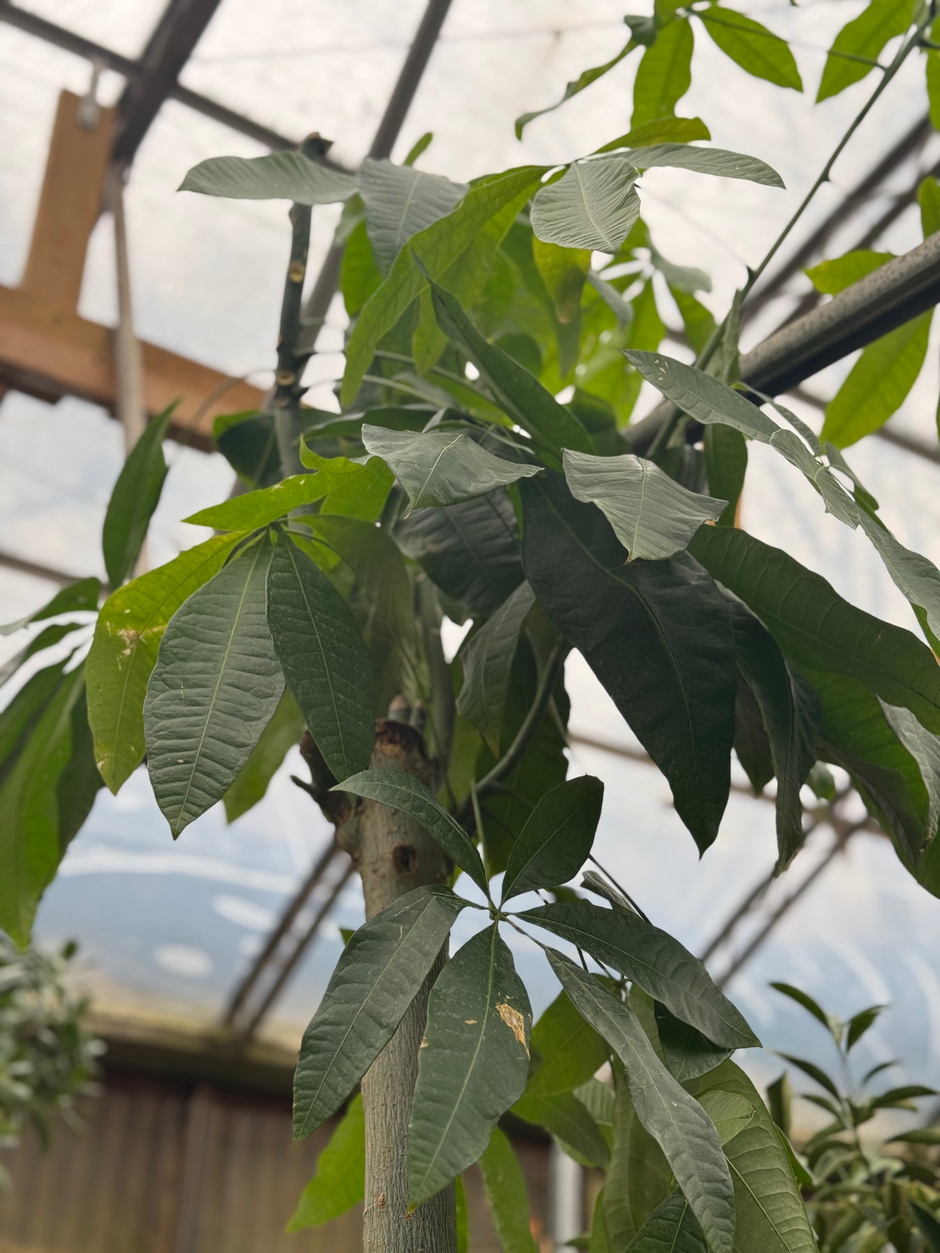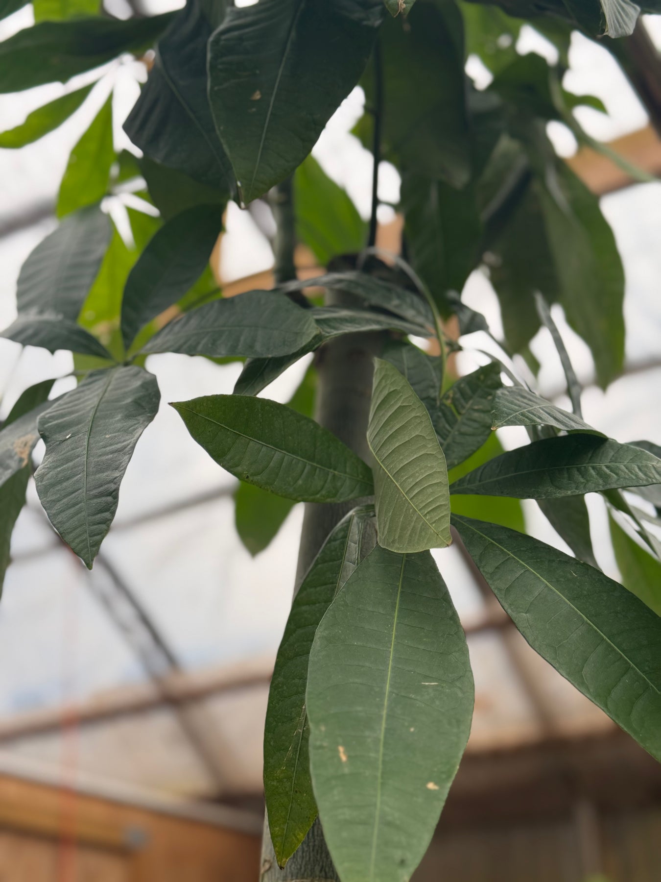 Pachira aquatica does best in bright, indirect light near a north or east-facing window. She'll tolerate lower light, though growth slows and the canopy gets a little leggy over time. Direct sun through glass can scorch those gorgeous glossy leaves, so filtered light is her preference.