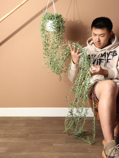 Being from a desert/rocky environment, it thrives in low humidity, dry soil, warm temperatures, and bright indirect light and will trail down 3 ft or more indoors. This makes them great to hang from a high ceiling where they will get ample light!